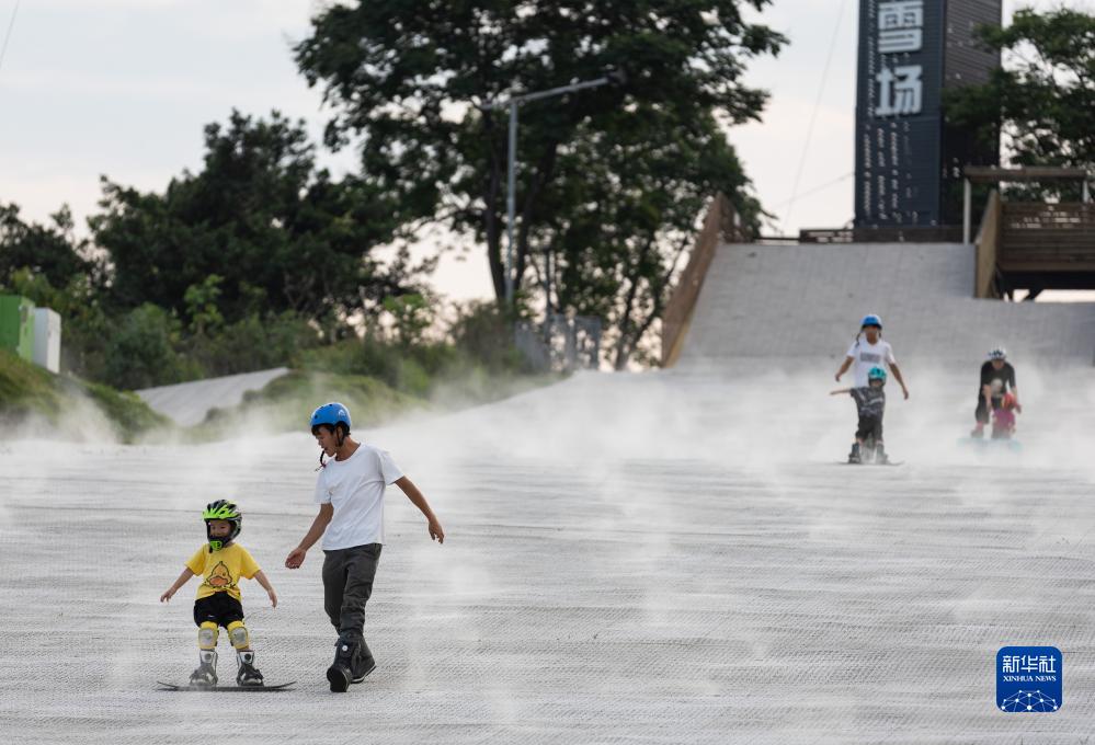 在成都美洲时尚体育公园,小朋友在教练的辅导下练习滑雪(7月18日摄)。