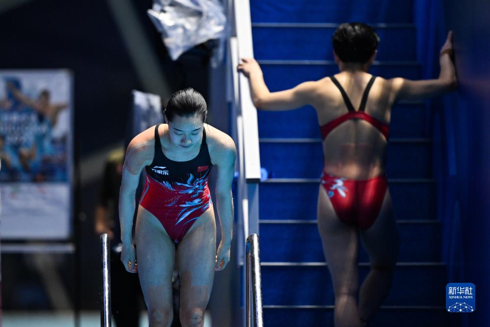 7月21日,中国选手昌雅妮(左)最后一跳结束,陈艺文(右)准备最后一跳。