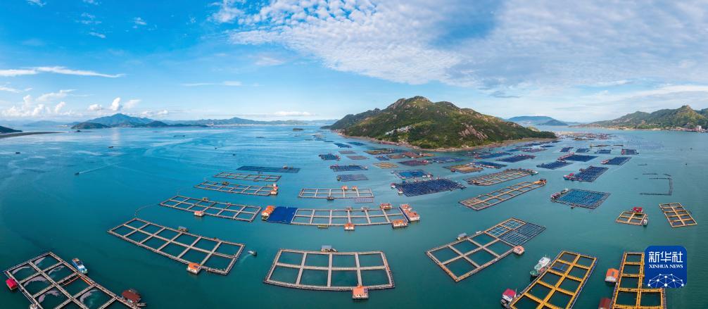 宁德三都澳白基湾海域,新型渔排绵延海上(无人机全景照片,7月17日摄)。