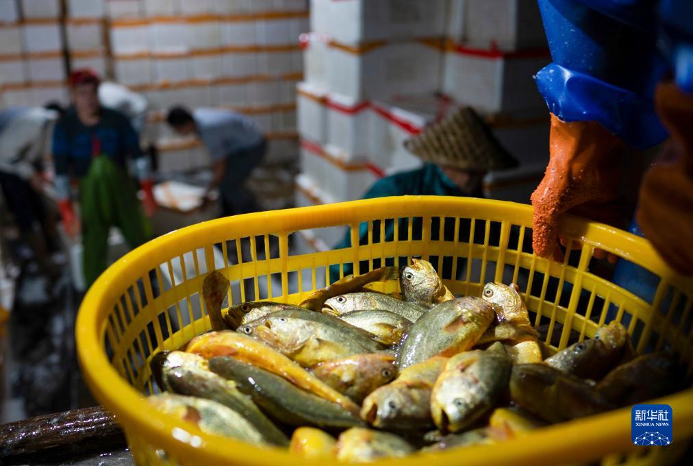 在宁德霞浦下浒海域渔排上拍摄的养殖户夜捕的大黄鱼(2021年11月25日摄)。