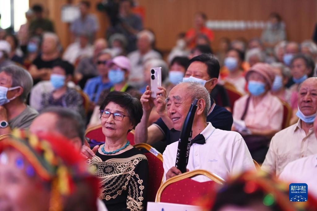 河北廊坊三河市燕达金色年华健康养护中心入住老人在观看文艺汇演(7月20日摄)。