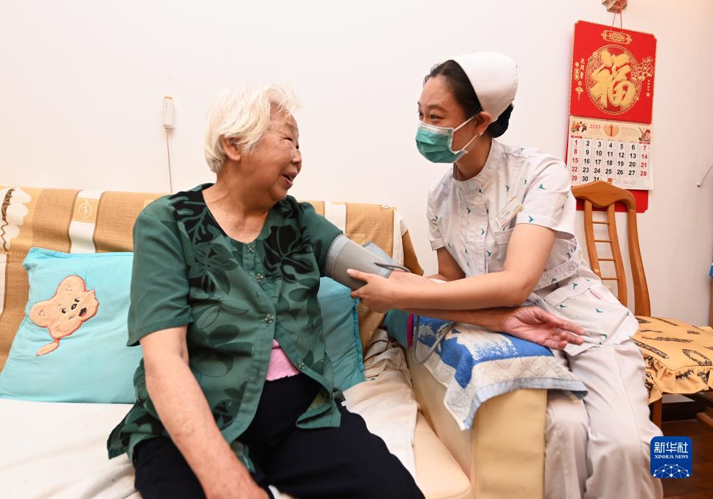 河北廊坊三河市燕达金色年华健康养护中心医务人员为入住老人测量血压(7月20日摄)。