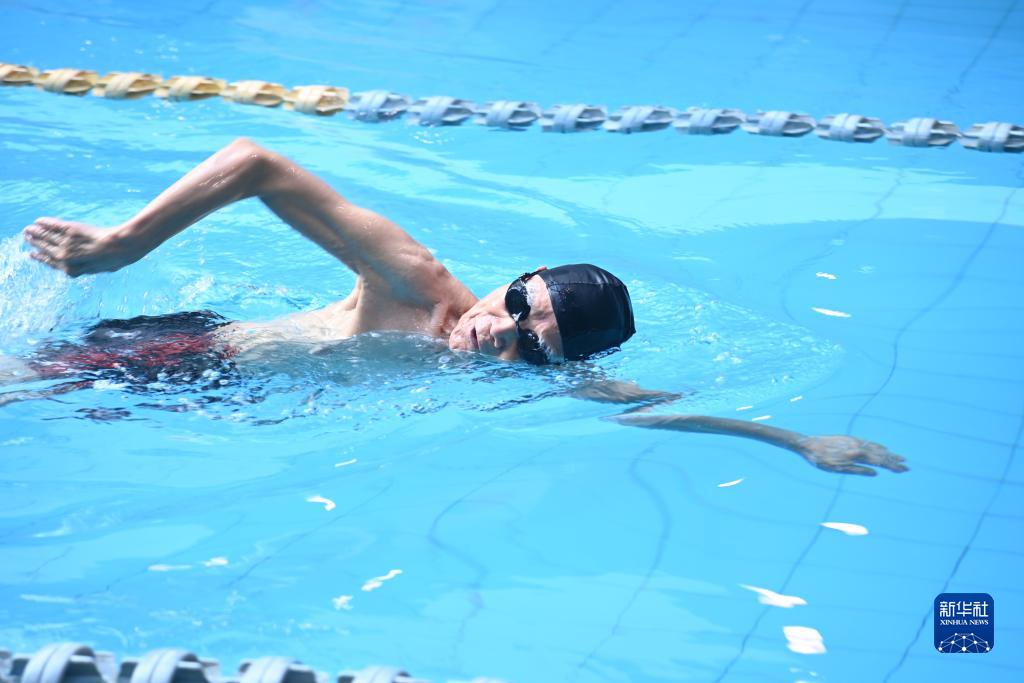 河北廊坊三河市燕达金色年华健康养护中心入住老人在游泳馆游泳(7月20日摄)。