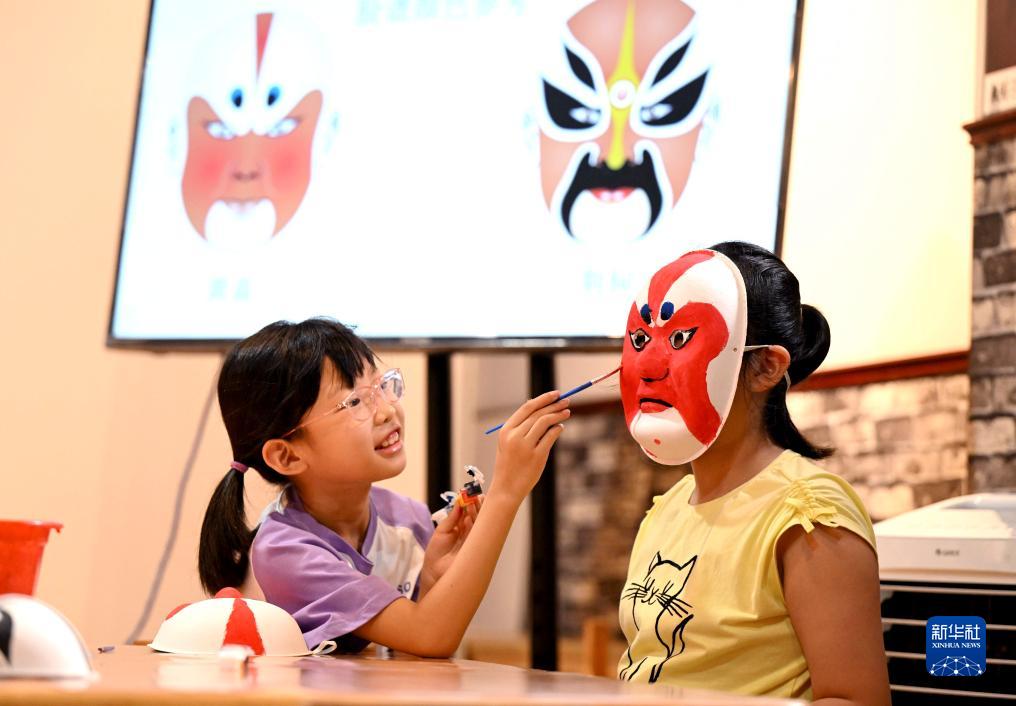 7月21日,小朋友在河北省石家庄市桥西区冀台联文化产业园学习脸谱制作技艺。