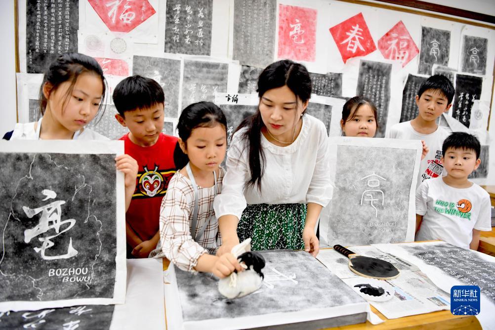 7月20日,在安徽省亳州市文化馆,孩子们在老师的指导下学习拓片技艺。