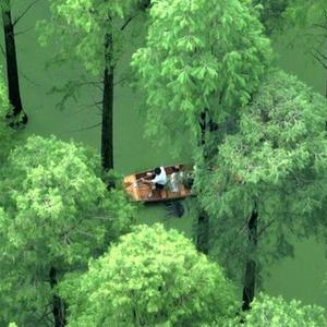 当日是中伏,在江苏省扬州市江都区渌洋湖湿地公园内“水上森林”,游客在水杉林中穿梭游览,享受夏日清凉。