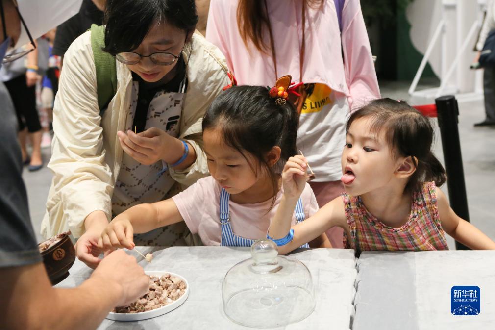 7月21日晚,小朋友在夜间“那达慕”大会上品尝美食。