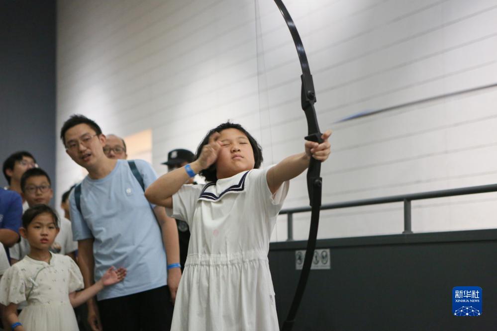 7月21日晚,小朋友在夜间“那达慕”大会上体验射箭。