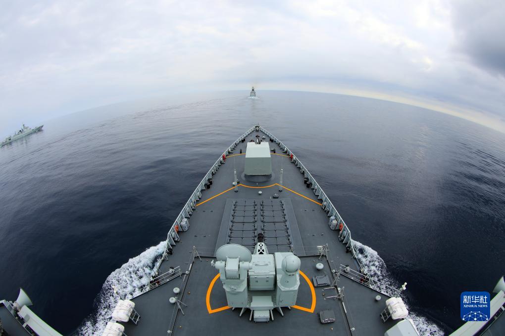 7月20日,在日本海某海域进行的“北部·联合-2023”演习中,中方海上作战群指挥舰齐齐哈尔舰破浪前行。