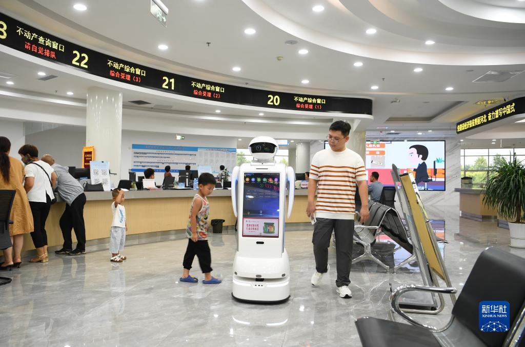 7月22日,河北省滦州市政务服务中心的机器人引导员在将办事群众带到指定窗口。