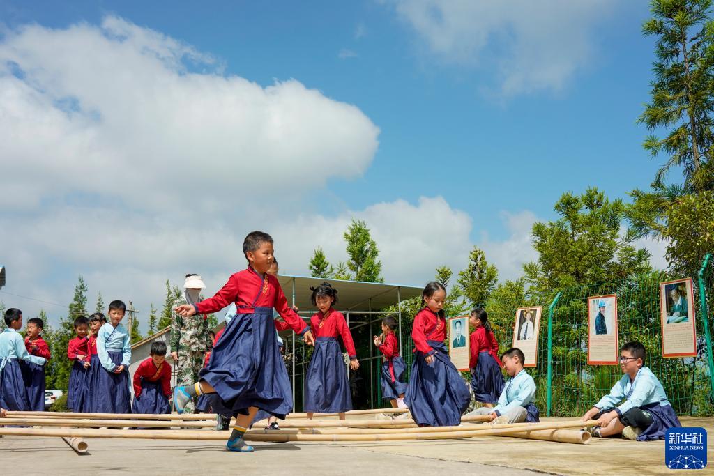 7月22日,万州区恒合土家族乡一个研学基地内,参加暑期避暑研学活动的学生在练习传统体育运动跳竹竿。