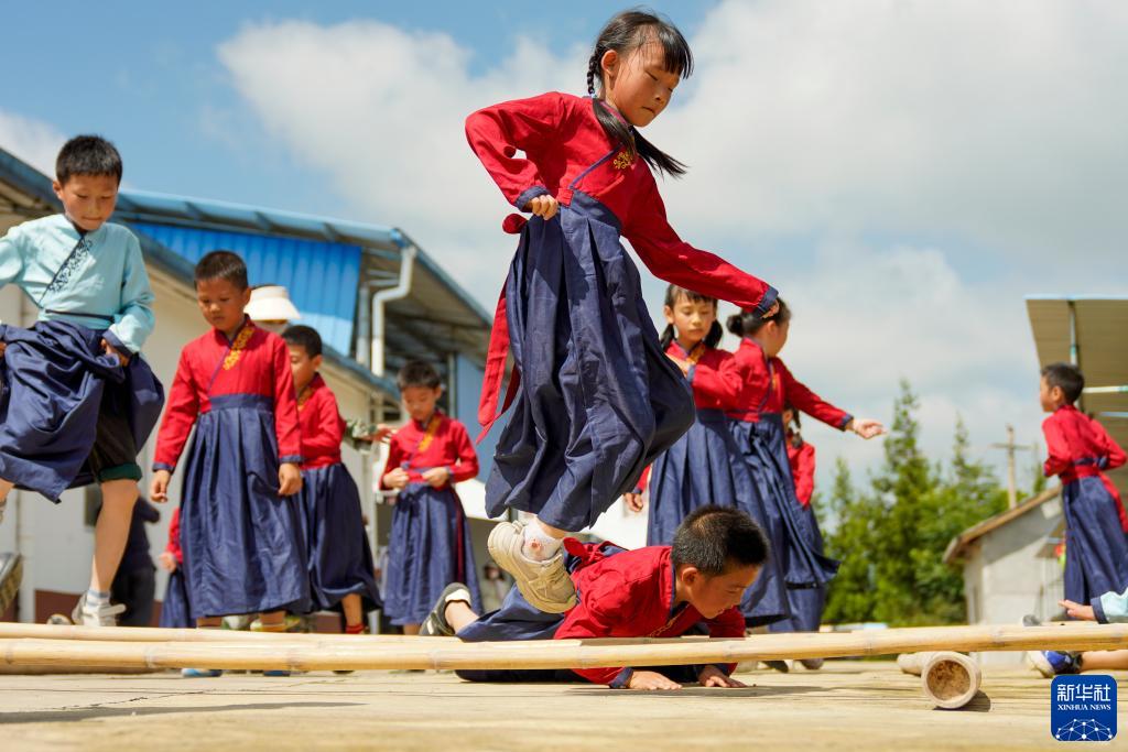 7月22日,万州区恒合土家族乡一个研学基地内,参加暑期避暑研学活动的学生在练习传统体育运动跳竹竿。