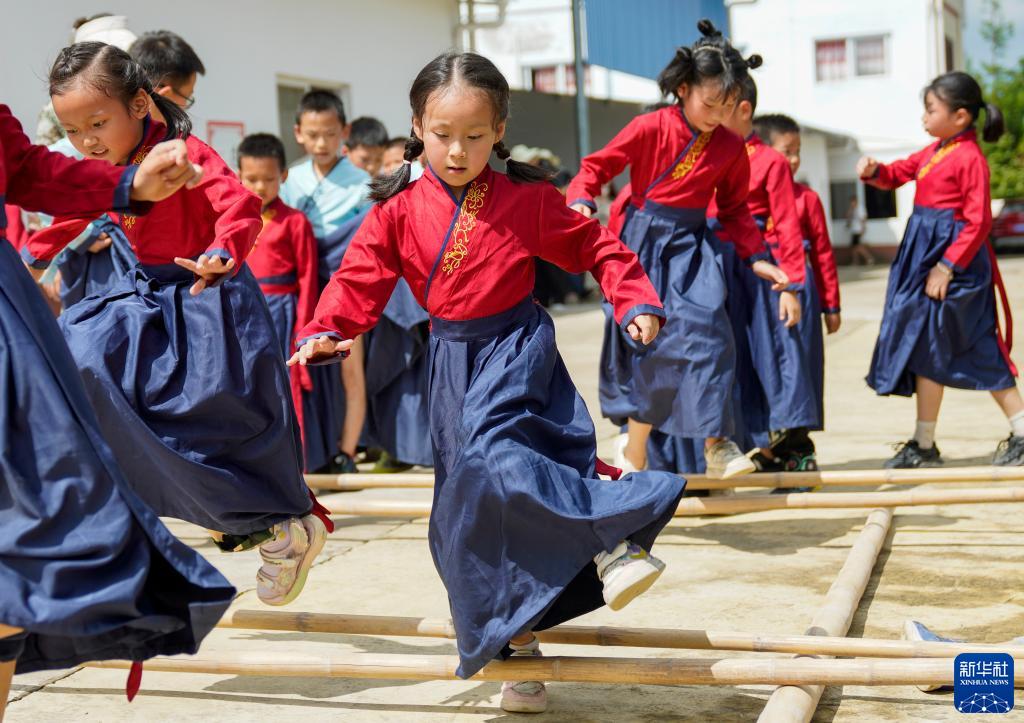 7月22日,万州区恒合土家族乡一个研学基地内,参加暑期避暑研学活动的学生在练习传统体育运动跳竹竿。