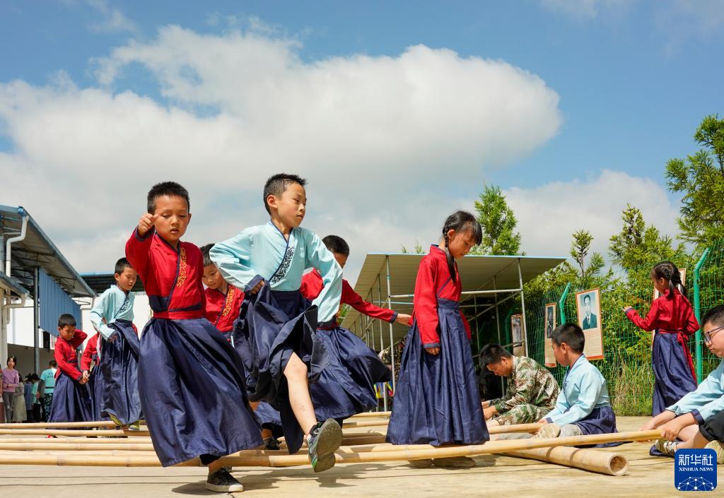 7月22日,万州区恒合土家族乡一个研学基地内,参加暑期避暑研学活动的学生在练习传统体育运动跳竹竿。