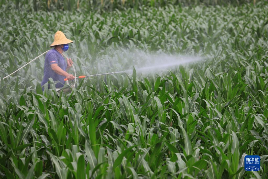 7月22日,在河南省焦作市温县黄庄镇东宋庄村,农民为玉米喷洒叶面肥。