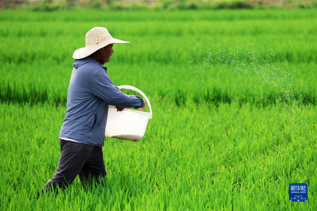 7月22日,在山东省临沂市郯城县郯城街道,农民为水稻施肥。