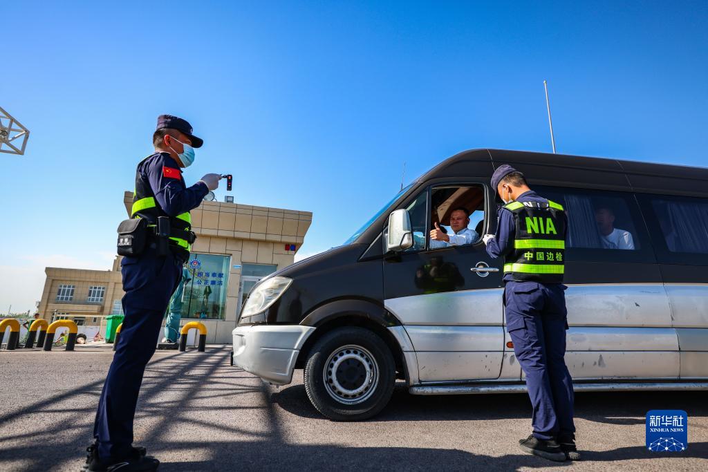7月21日,霍尔果斯出入境边防检查站执勤民警在对入境车辆进行查验。