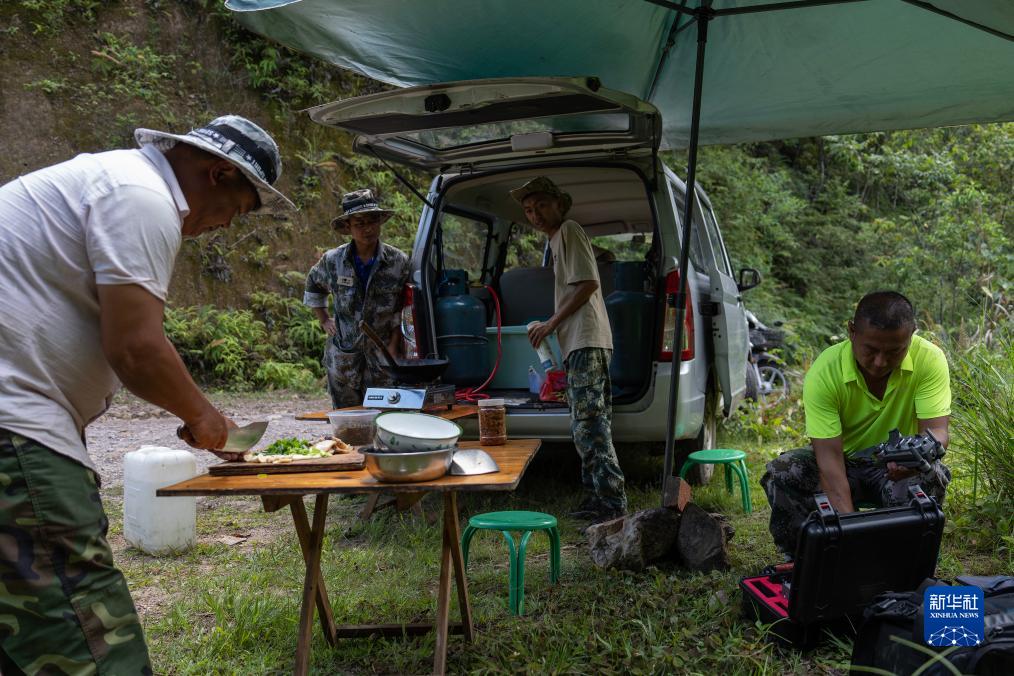 7月20日,刁发兴(右一)收起无人机,准备和队友做饭。