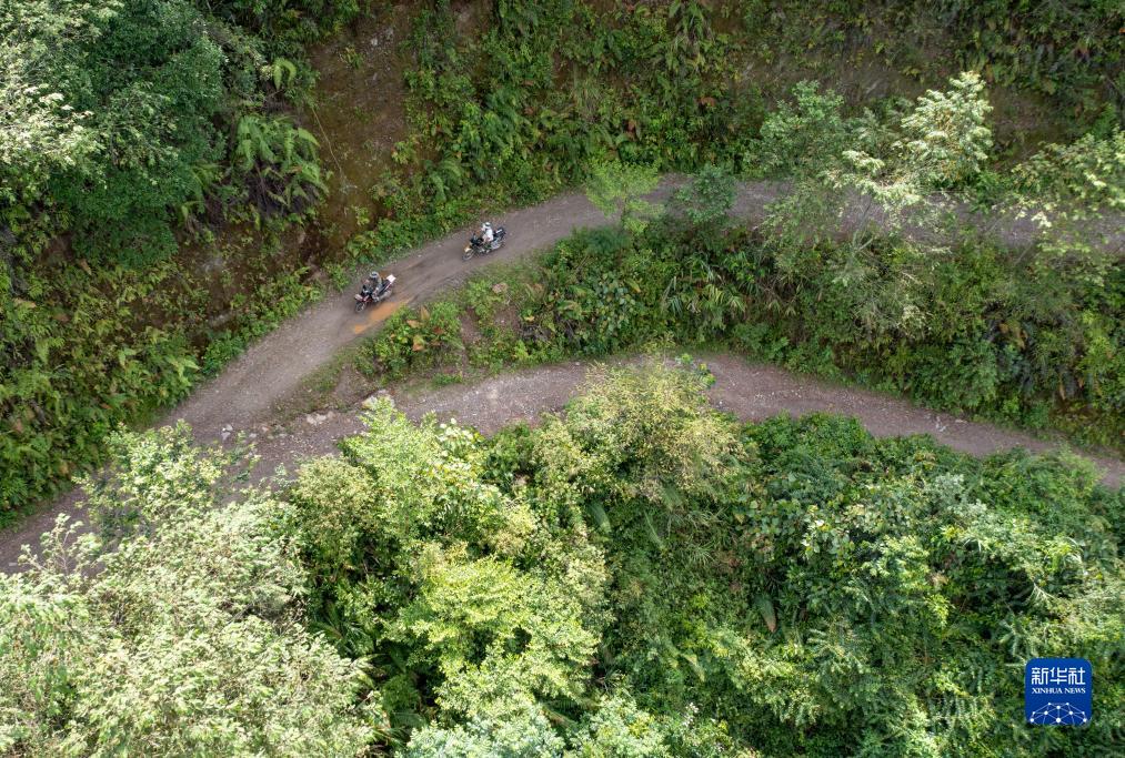 两名监测队队员骑着摩托车去监测野象(7月20日摄,无人机照片)。
