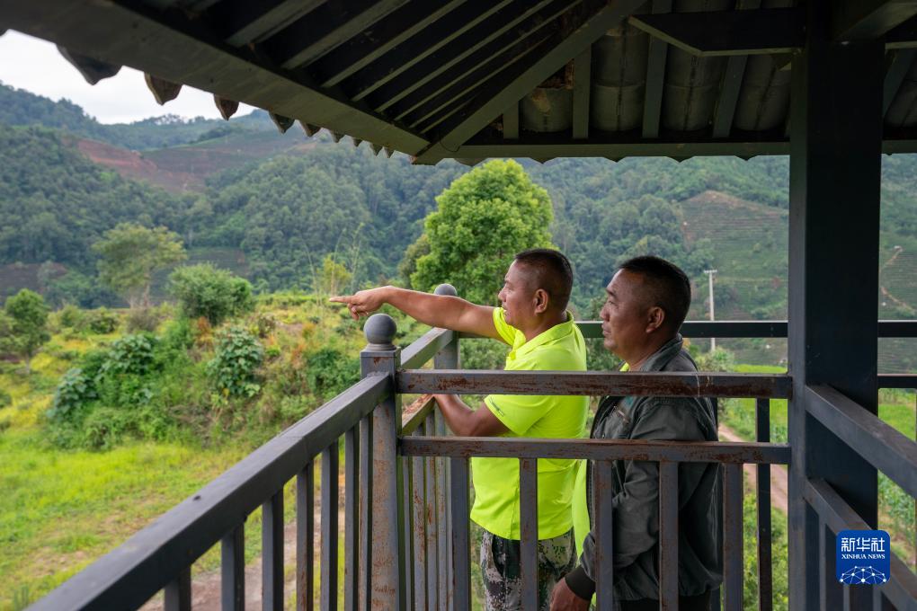 刁发兴(左)和一名监测队队员在江城县一处野象监测塔上查看野象活动情况(7月19日摄)。