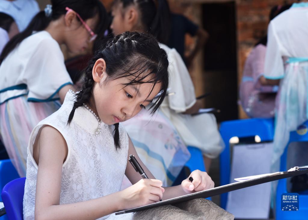 7月22日,在湖南省郴州市嘉禾县晋屏镇雷公井村,小朋友在写生。