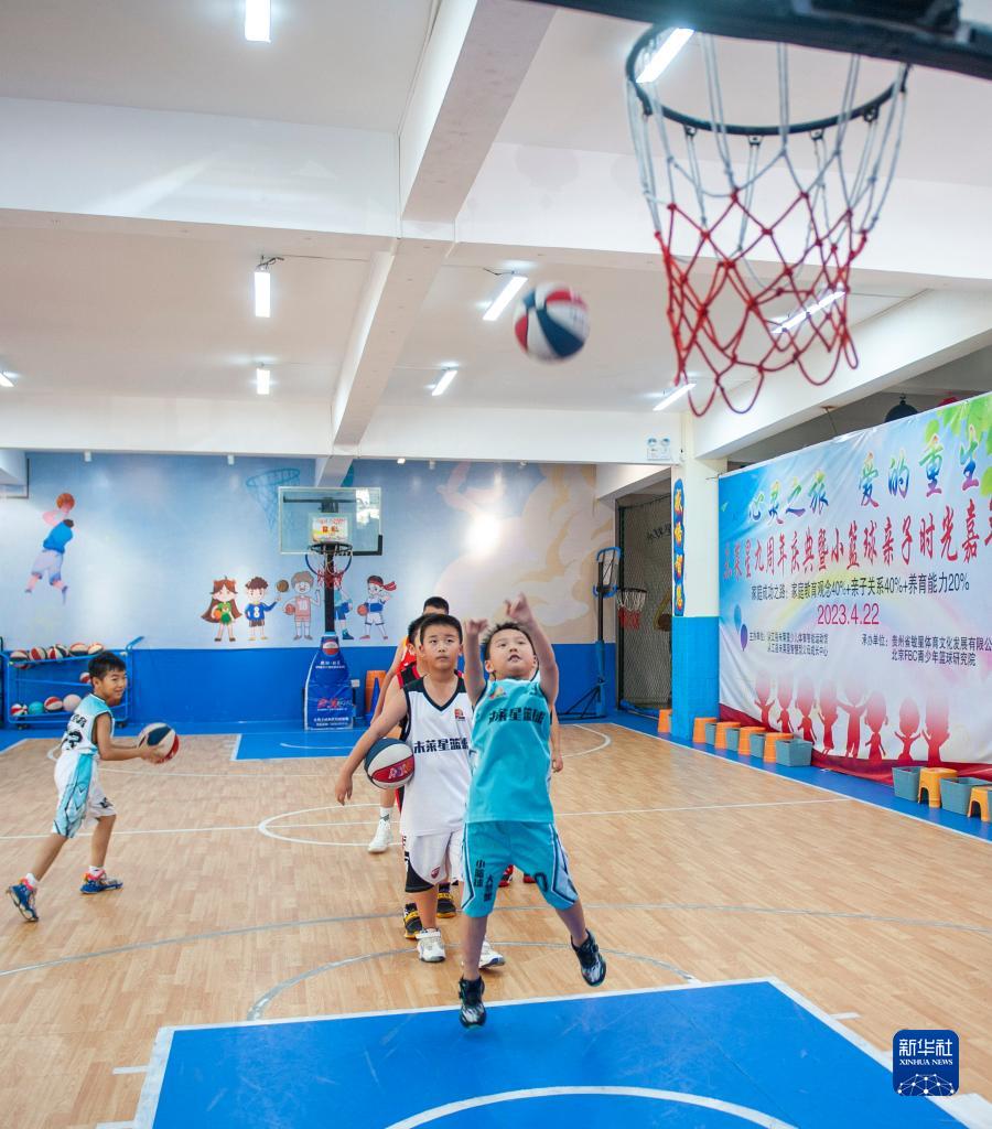 7月22日,小朋友在贵州省黔东南苗族侗族自治州从江县一家篮球馆进行篮球训练。