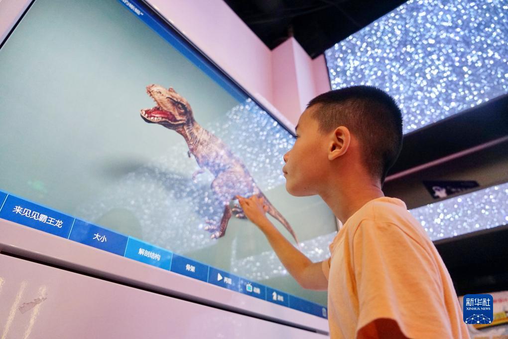 7月22日,小朋友在浙江省嘉兴市图书馆元宇宙阅读体验馆通过3D互动知识模型学习知识。