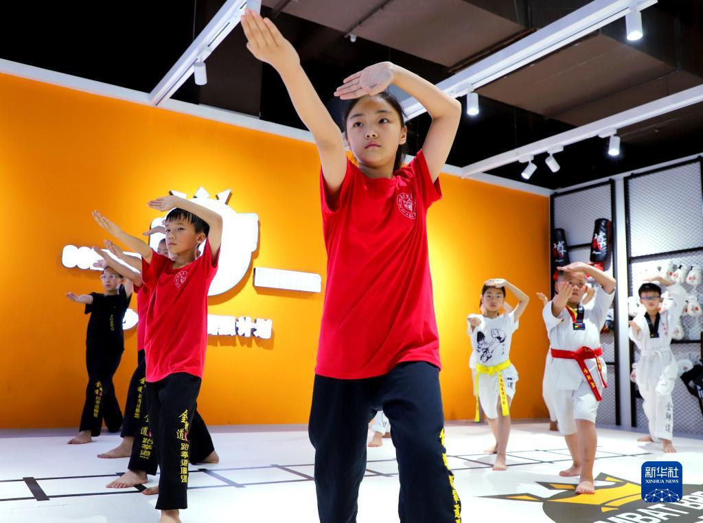 7月22日,在河南省南阳市区一家跆拳道馆内,学生练习跆拳道。