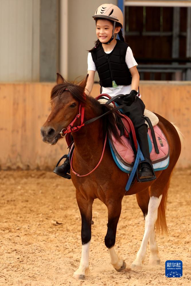 7月22日,在山东省枣庄市一家马术俱乐部,小学生骑马参加“盛装舞步”比赛。