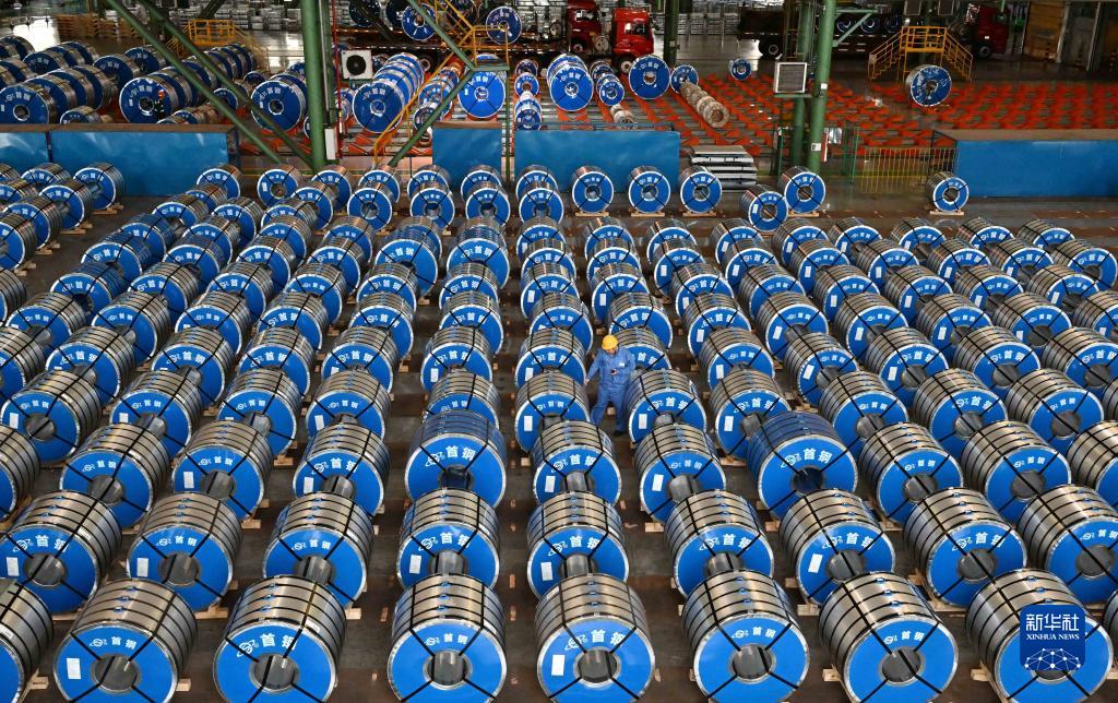 首钢京唐钢铁联合有限责任公司工人在镀锡板事业部成品库工作(7月22日摄)。