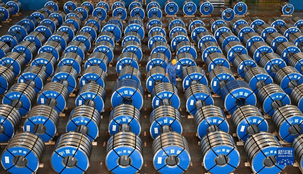 首钢京唐钢铁联合有限责任公司工人在镀锡板事业部成品库工作(7月22日摄)。