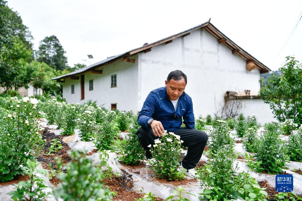 朱大清在地里查看自己种植的药用菊花(7月19日摄)。