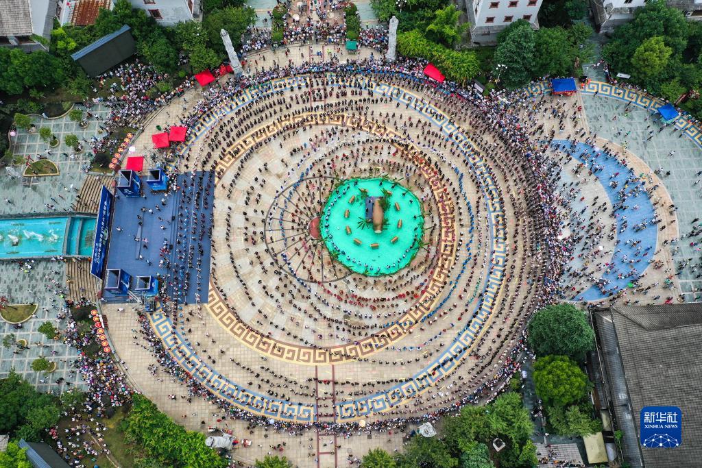 7月23日,人们在贵州剑河仰阿莎文化节上跳苗族水鼓舞(无人机拍摄)。