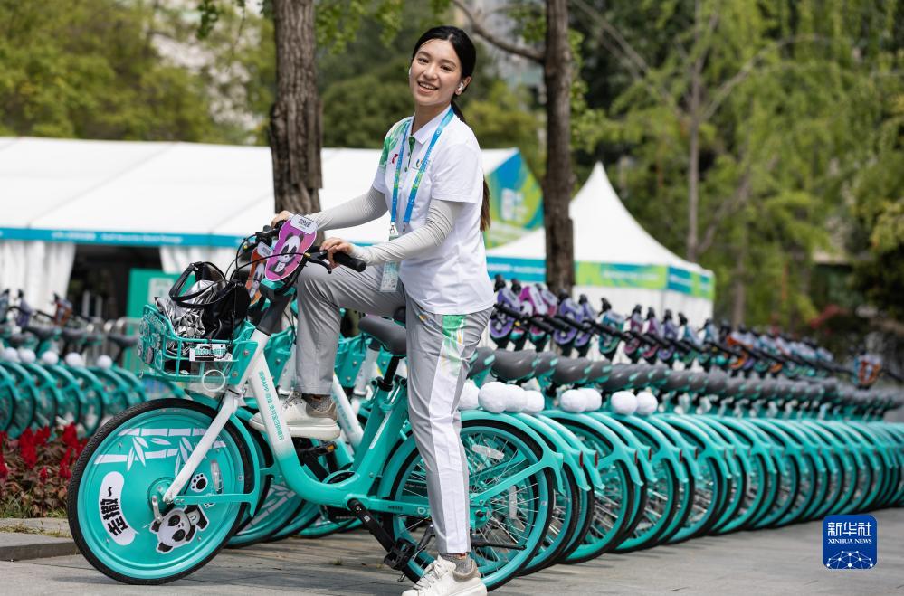 7月20日,一名志愿者骑着大运会定制共享单车留影。以大运会吉祥物“蓉宝”作为主元素的定制单车已在校园和街头投放使用。