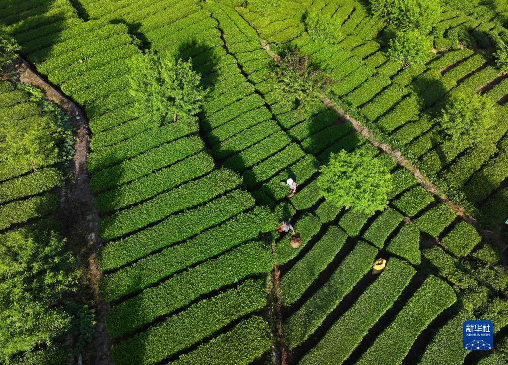 7月23日,湖北省宜昌市秭归县茅坪镇松树坳村的村民在茶园里采摘夏茶(无人机照片)。