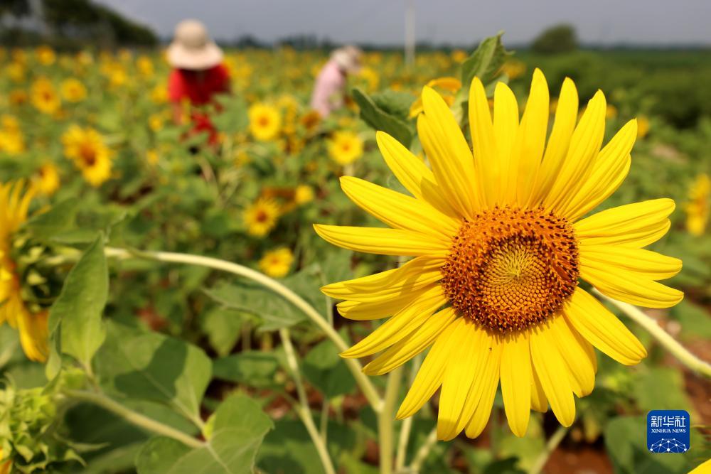 7月23日,山东省枣庄市市中区农民在田间管护向日葵。