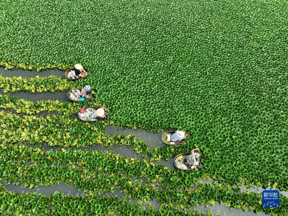 7月23日,江苏省泰州市姜堰区娄庄镇三联村的农民划着木桶在菱塘采摘菱角(无人机照片)。