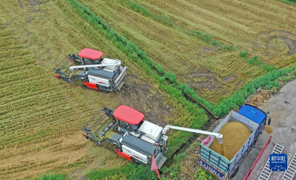 7月23日,浙江省台州市仙居县白塔镇,农民将收割的稻谷装车(无人机照片)。