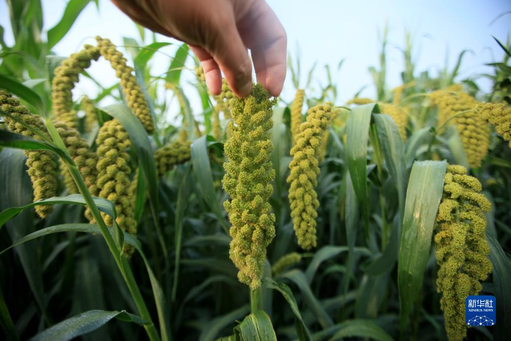 7月23日,山东省临沂市平邑县地方镇西瑶草村村民在查看谷子长势。
