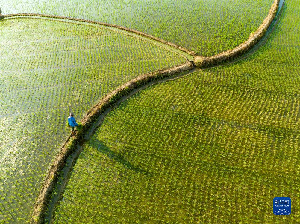 7月23日,在湖南省永州市道县蚣坝镇长江圩村,农民提着秧苗走在田埂上(无人机照片)。