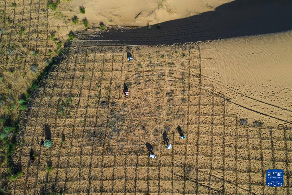 7月22日,工人在杭锦旗境内的S215线道路两旁扎制草方格沙障(无人机照片)。