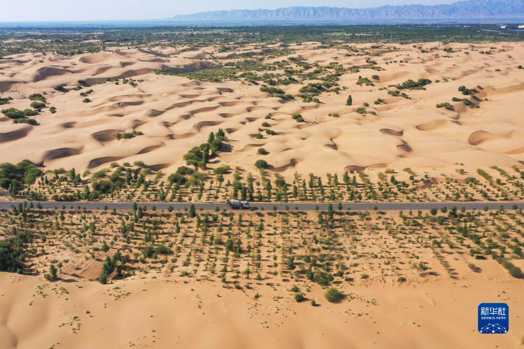 夏日时节,内蒙古自治区杭锦旗境内的穿沙公路绿意盎然,绿色沿着道路前行,并向两旁的沙地铺展,犹如一条条“绿色动脉”在库布其沙漠中绵延。