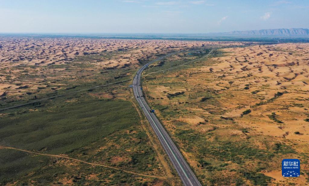 夏日时节,内蒙古自治区杭锦旗境内的穿沙公路绿意盎然,绿色沿着道路前行,并向两旁的沙地铺展,犹如一条条“绿色动脉”在库布其沙漠中绵延。