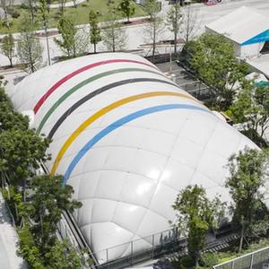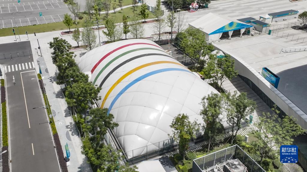 这是7月22日在成都高新体育中心多功能馆外拍摄的临时训练气膜馆(无人机照片)。该临时训练气膜馆采用轻型装配式气膜结构,利用气压来支撑,无需任何梁、柱,可得到更大的完全净空的建筑空间,具有节约能源、减少水资源消耗、降低二氧化碳排放量、延长使用寿命、降低建筑物运行成本、促进可持续发展等优点。