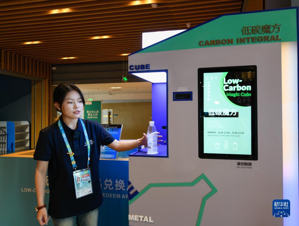 7月16日,在大运村艺术中心内,工作人员展示如何使用“低碳魔方”。将喝完的矿泉水瓶废弃品投入“低碳魔方”可获得“碳积分”小票,凭小票可兑换相应的大运会礼品。