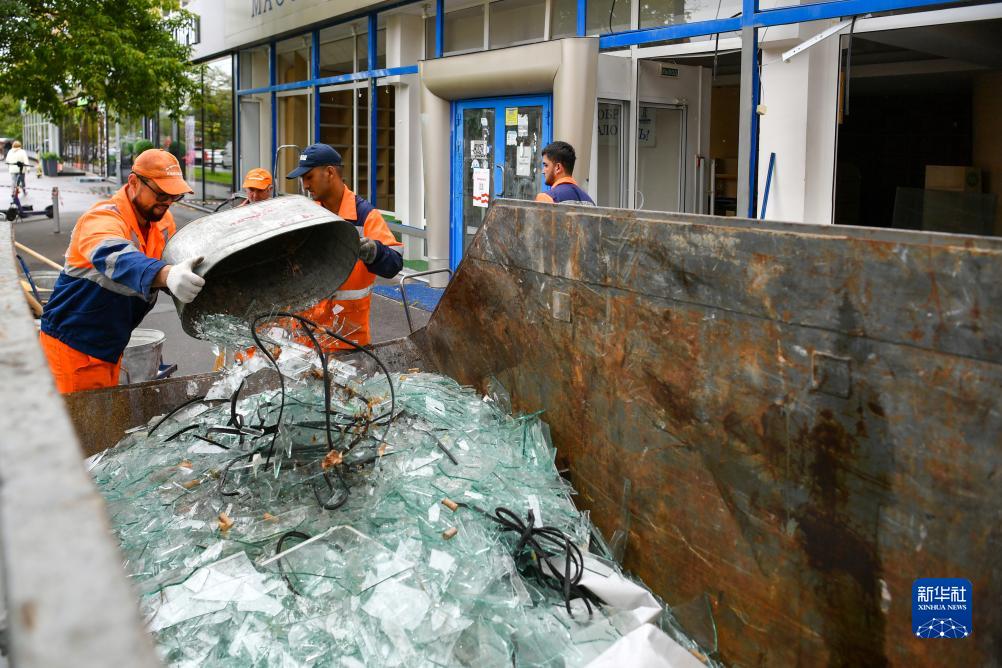 7月24日,在俄罗斯莫斯科,工作人员在遭无人机袭击的建筑现场进行清理工作。
