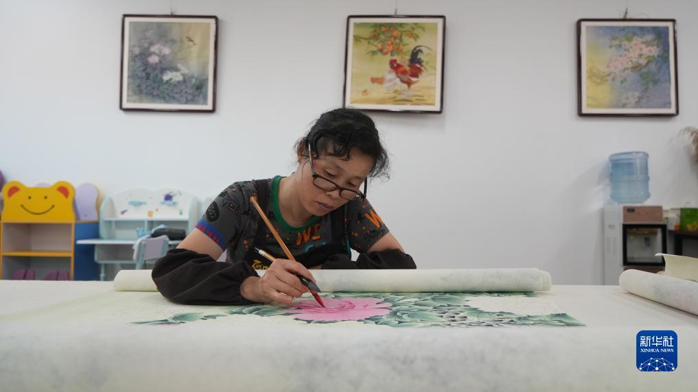 7月24日,画师在山东省巨野县书画院绘制工笔画作品。