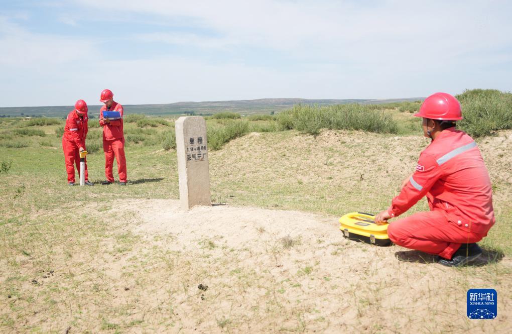 巡线队员在巡线时利用探测仪检测管线埋藏深度(7月23日摄)。