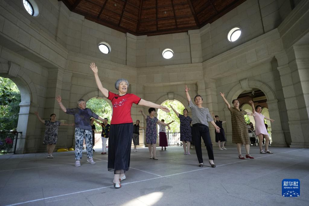 7月25日,老年人在河北省唐山市路北区橡树湾社区养老服务中心练习跳舞。