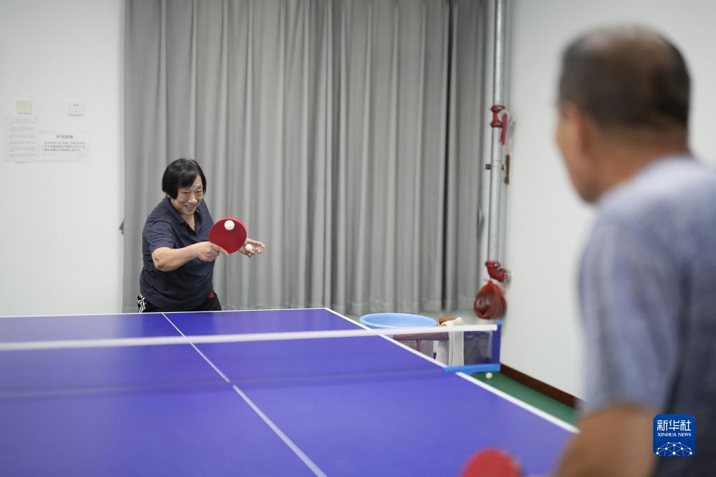 7月25日,老年人在河北省唐山市路北区煤研分院社区养老服务中心打乒乓球。